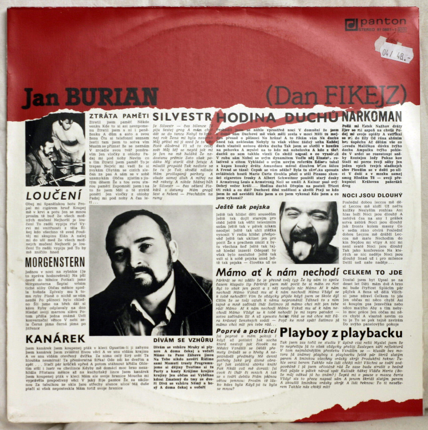 A1 Noci Jsou Dlouhý 2:20 A2 Poprvé A Potisící 2:53 A3 Ztráta Paměti 3:15 A4 Kanárek 3:13 A5 Loučení 1:40 A6 Morgenstern 3:47 A7 Silvestr 2:26 B1 Hodina Duchů 2:48 B2 Dívám Se Vzhůru 3:28 B3 Mámo, Ať K Nám Nechodí 2:55 B4 Playboy Z Playbacku 2:52 B5 Narkoman 2:28 B6 Ještě Tak Pejska 2:51 B7 Celkem To Jde 3:01 Recorded At – Studio Smetanova Divadla